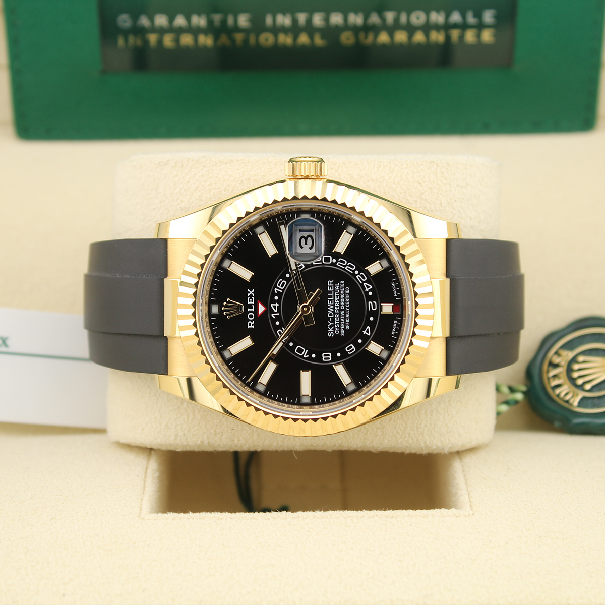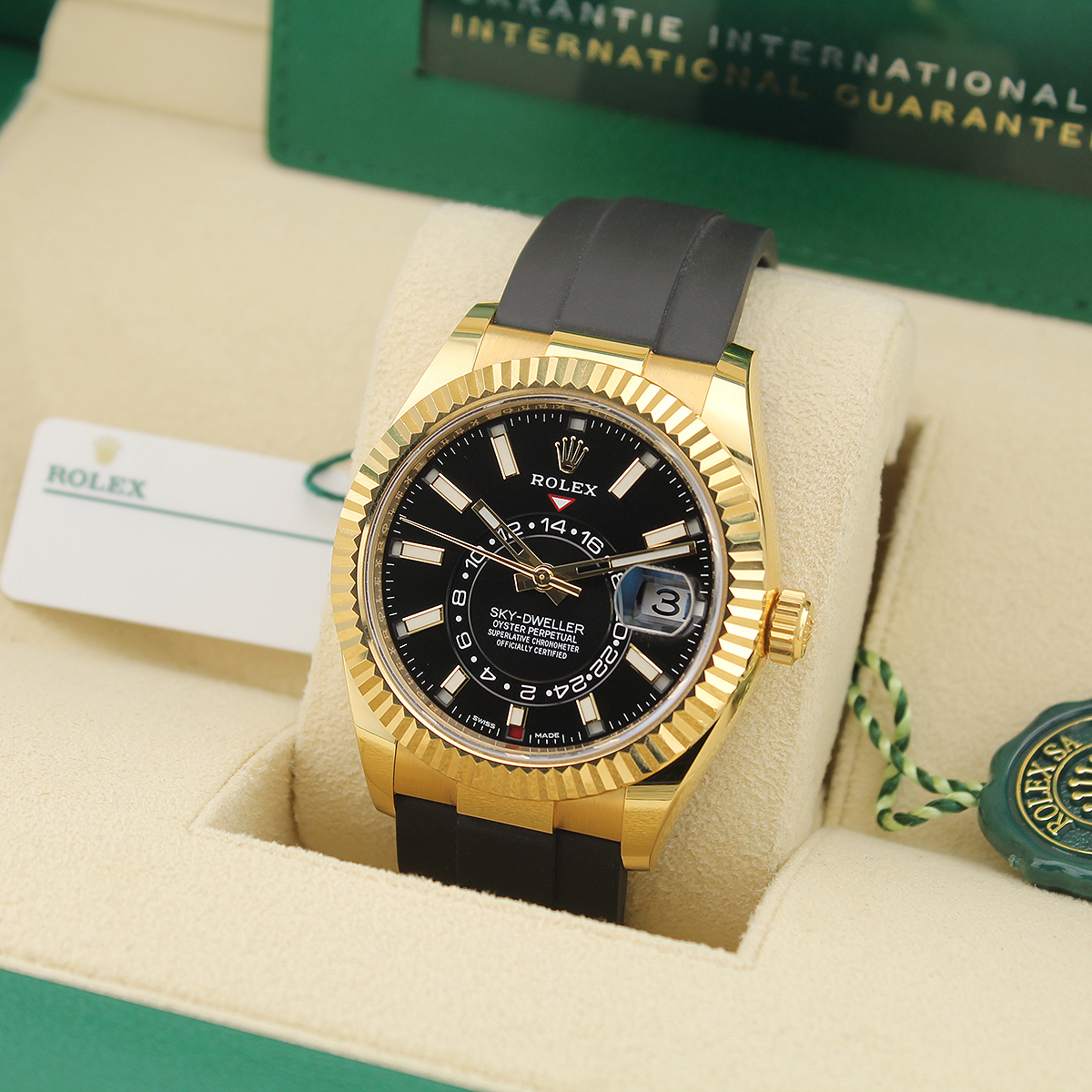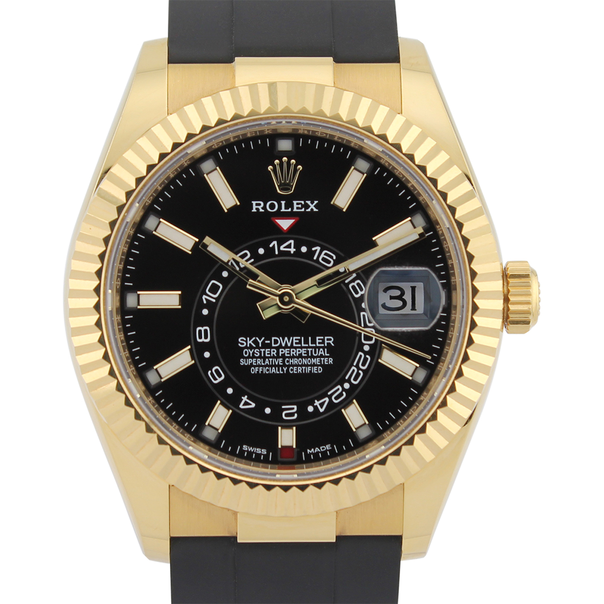 The Rolex Sky-Dweller 326238 is a 42mm annual calendar and dual time zone watch crafted in 18ct yellow gold. It features a black dial with baton hour markers and the innovative off-centre 24-hour disc for tracking a second time zone.