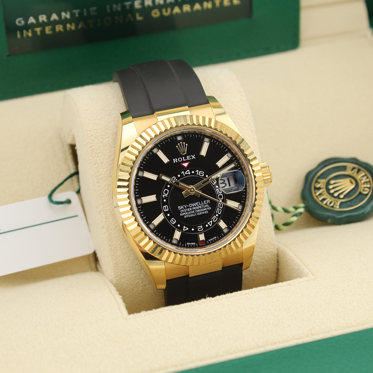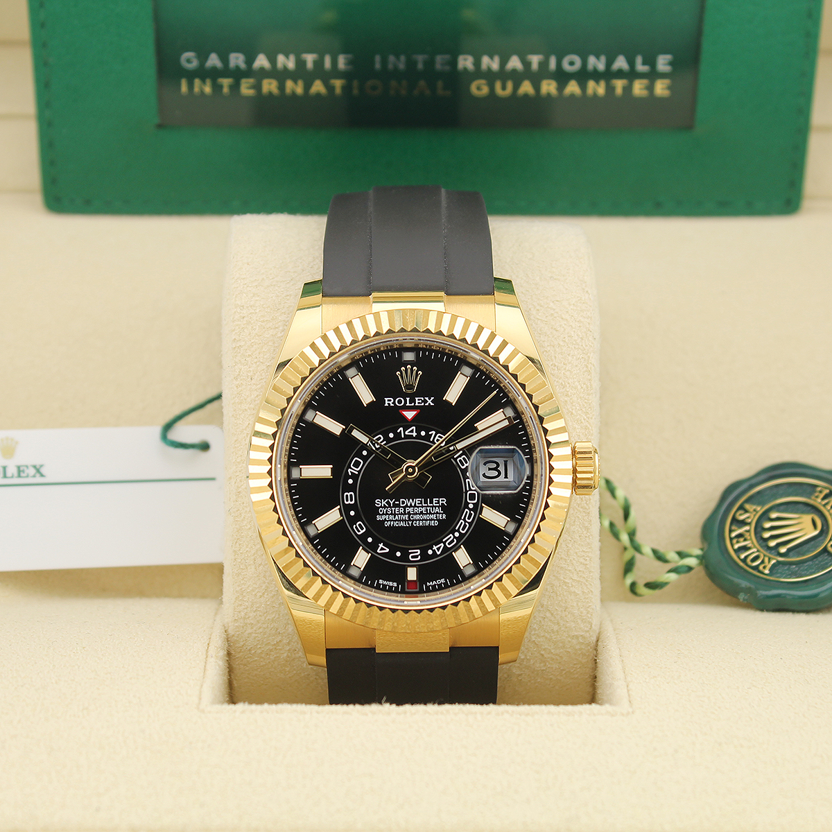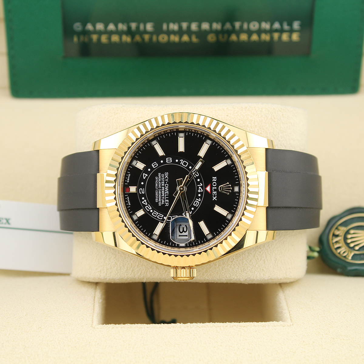 The Rolex Sky-Dweller 326238 is a 42mm annual calendar and dual time zone watch crafted in 18ct yellow gold. It features a black dial with baton hour markers and the innovative off-centre 24-hour disc for tracking a second time zone.