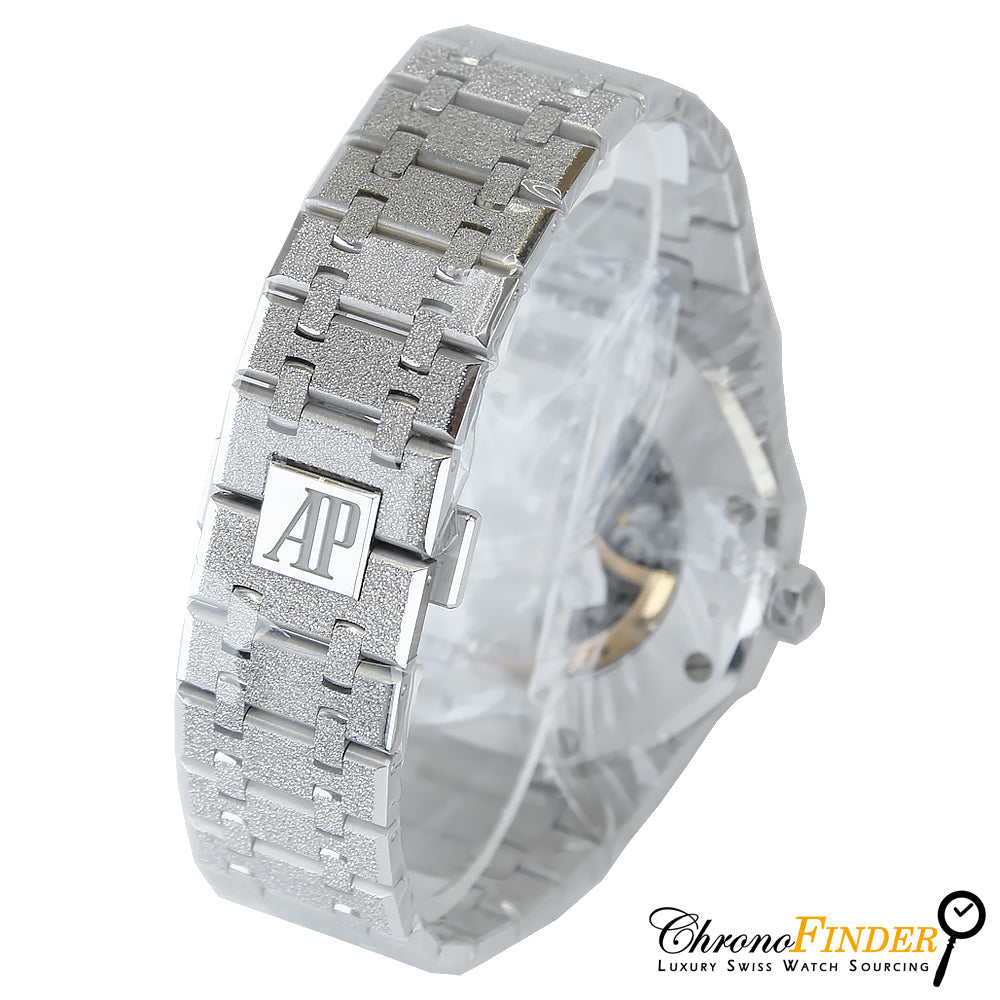 “Frosted Gold” refers to a special finishing technique using the Florentine hammering method on the 18-carat white gold, creating tiny facets that sparkle like diamond dust. This gives the case and bracelet a shimmering, textured finish distinct from polished or brushed surfaces.
